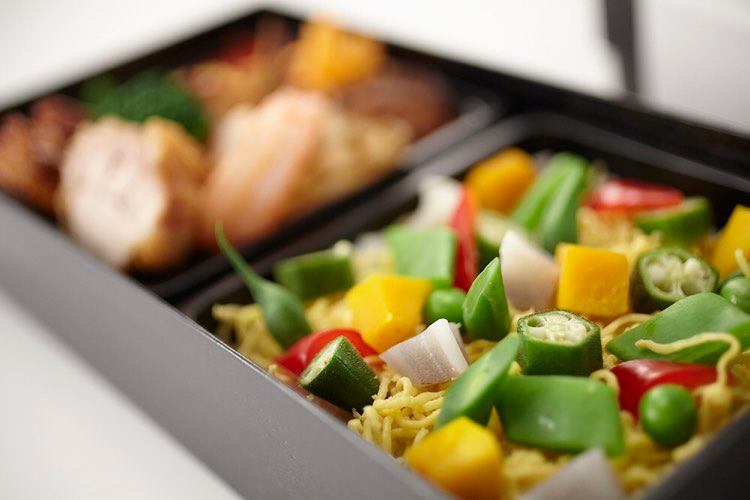 沢山のおかずと白米の半量を野菜たっぷりに置き換えた小社独特の【かて飯】を組み合わせた最近の新商品(ご飯を白米に変更することも可能です)。